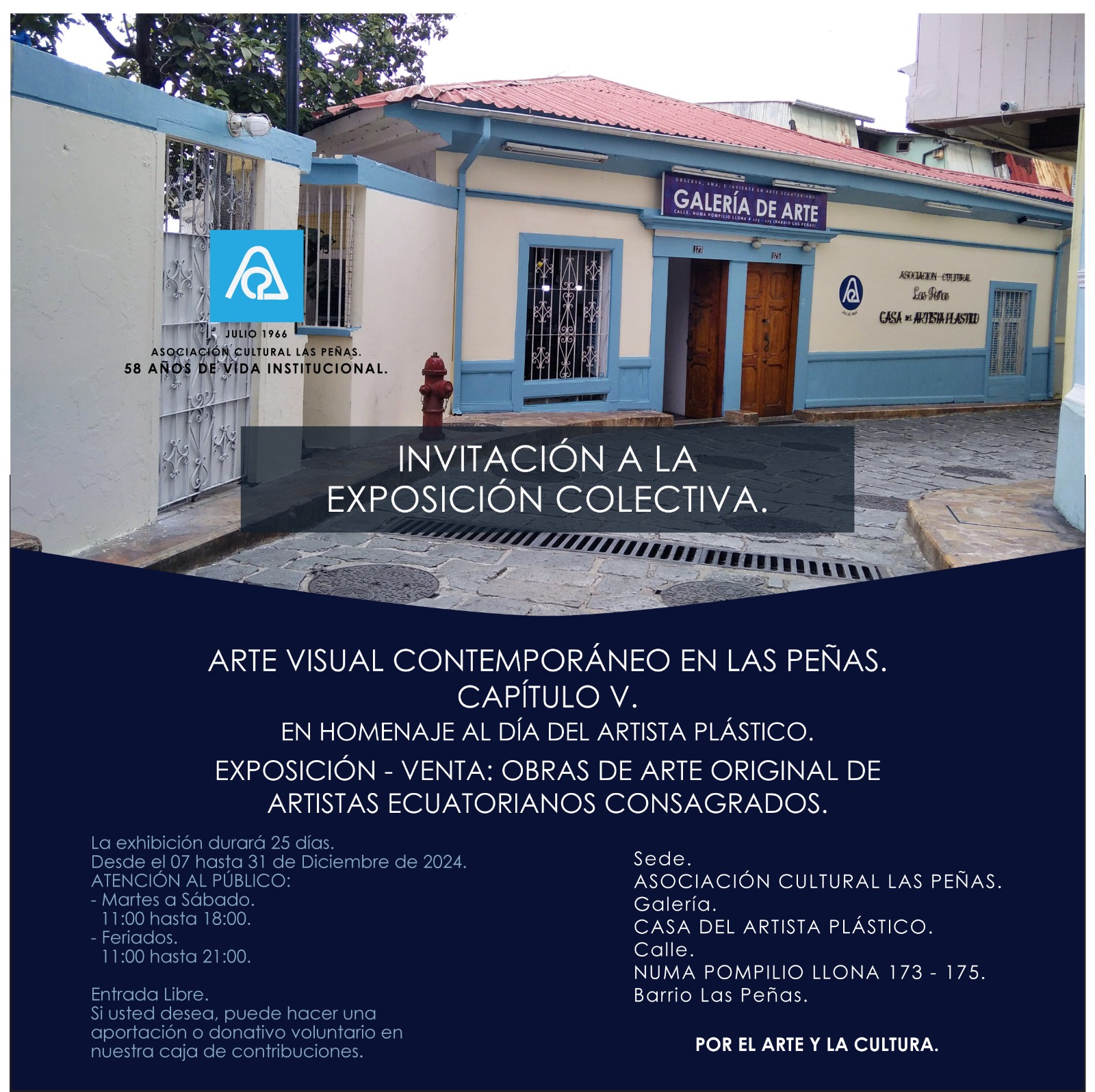 LA ASOCIACIÓN CULTURAL LAS PEÑAS, CUMBRE Y CUNA DEL ARTE GUAYAQUILEÑO, ha inaugurado su ultima exposición del año 2024 En homenaje al Día del Artista Plástico. La inauguración se realizó el 7 de diciembre del 2024 en la Casa del Artista Plastico de las Peñas.