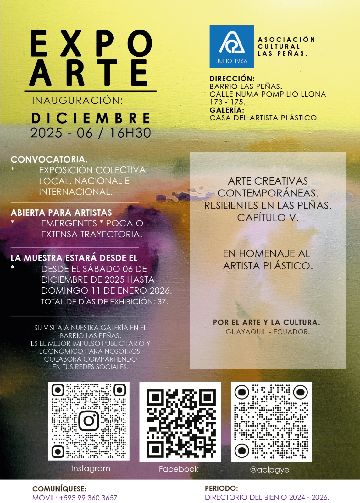 La directiva del bienio 2024 – 2026, encabezada por el presidente Eloy David Cumbe Farías, reafirma su compromiso con la difusión del arte y la cultura, invitando a toda la comunidad a ser parte de esta experiencia única.