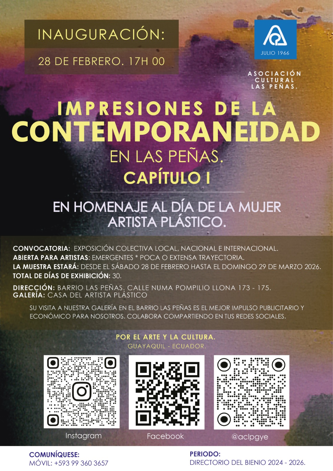 Con motivo del 488° aniversario de la fundación de Guayaquil y los 59 años de vida institucional de la Asociación Cultural Las Peñas, se llevó a cabo la tercera edición de la exposición colectiva “Creativas Contemporáneas. Resilientes en Las Peñas”. Este evento reunió a artistas nacionales e internacionales que, a través de sus obras, celebraron la fuerza creativa, la diversidad estética y el compromiso con el arte como herramienta de transformación.